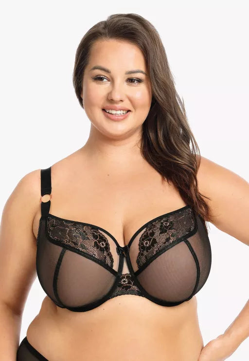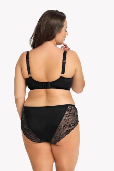Carmen Maxi är en sensuell ovadderad bh i skir oelastisk spets. Färgen är beige/svart med kopparfärgade detaljer i spetsen. Bra rundat lyft.