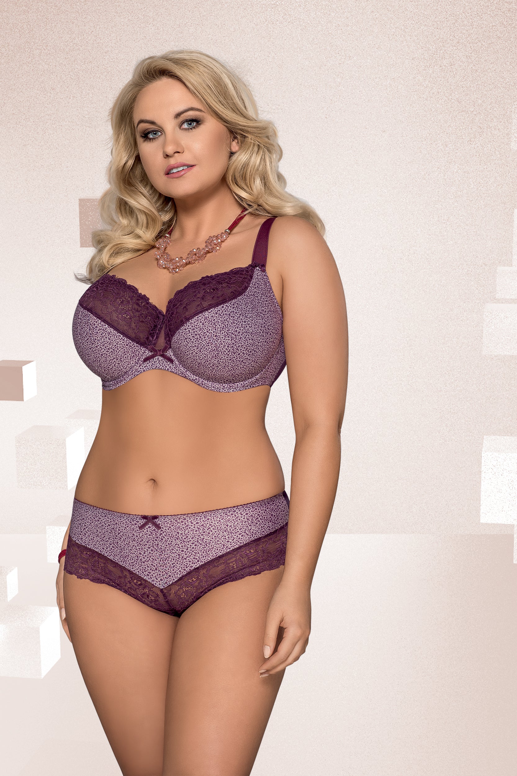 Mia Maxi är en halvvadderad bh i lila med fläckmönster. Spetsen upptill är elastisk. Lyfter bra. Bekväm och snygg.