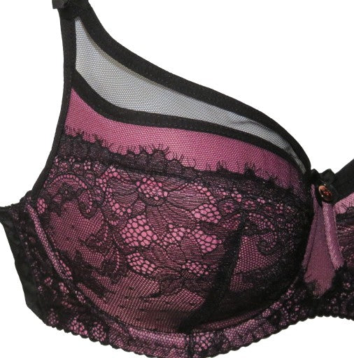 Zoe är en vacker helvadderad bh med mörk gammelrosa botten och en svart spets ovanpå. Mechen upptill i svart är oelastisk. Lyfter bra.